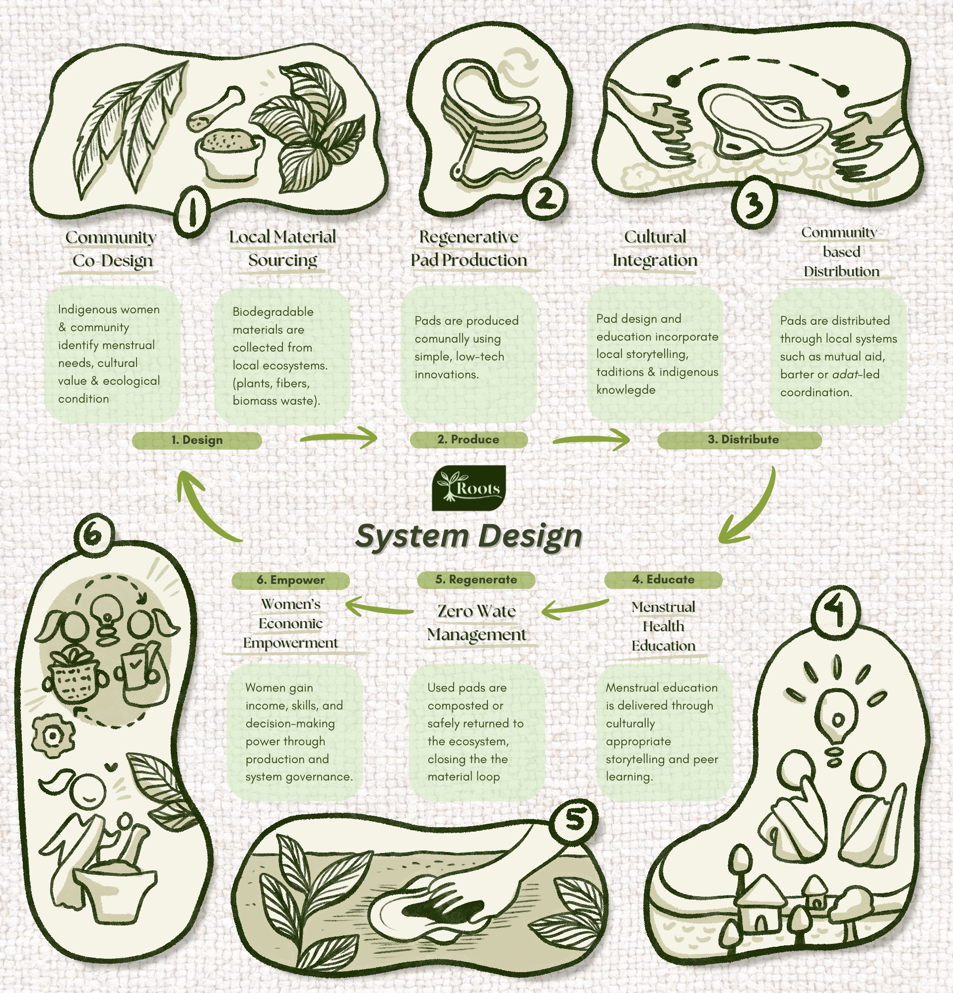 ROOTS, an acronym for Regenerative, Organic, and Traditional Systems, is a comprehensive menstrual care system designed specifically for the Orang Rimba indigenous community in Sumatra’s Bukit Duabelas National Park. Rather than adapting existing products, ROOTS rebuilds menstrual care from first principles by integrating forest-adapted materials, community-owned economic structures, and culturally-grounded education into a single interconnected framework.