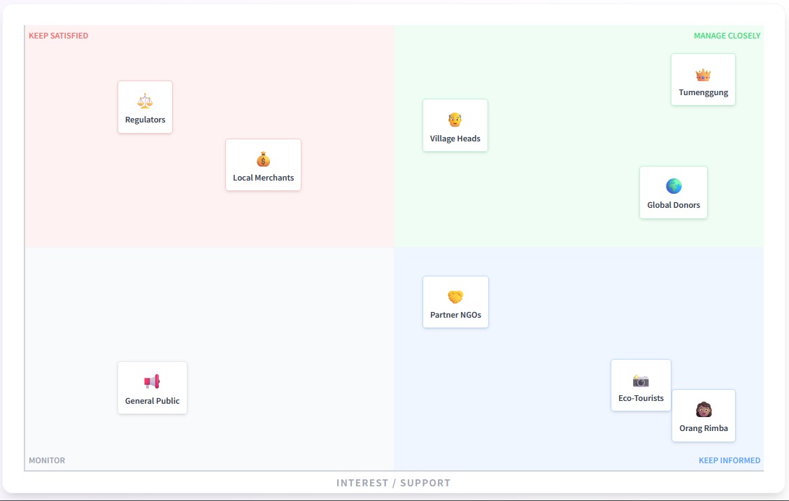 Engagement strategy follows a power-interest matrix. The Tumenggung, village heads, and global donors require close management through regular communication and active involvement in decision-making. Orang Rimba women, partner NGOs, and eco-tourists require regular information through newsletters, progress reports, and community meetings. Regulators require satisfaction through compliance and reporting. The general public requires monitoring but minimal active engagement.