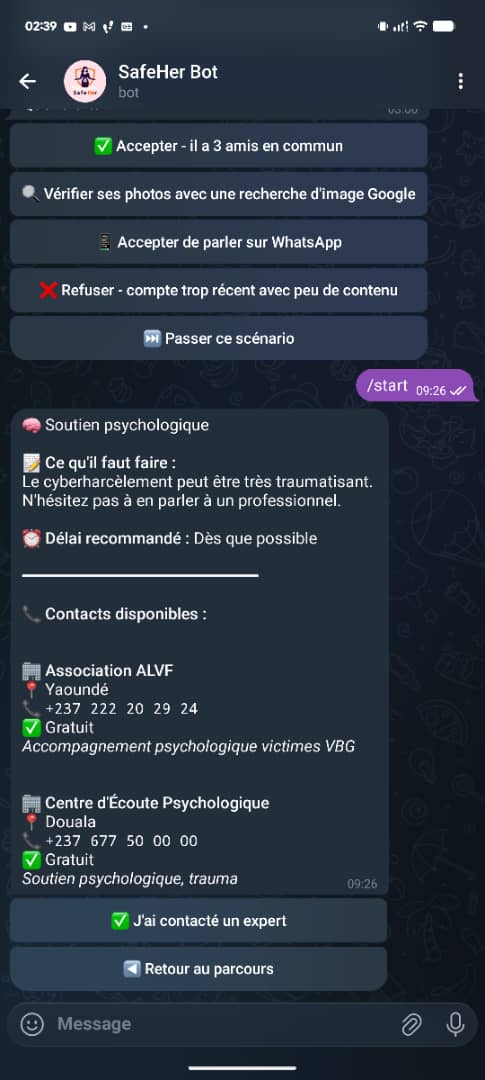 At the core of the project is the development and deployment of two integrated digital tools: a renamable Telegram chatbot and an educational web-based platform. The Telegram chatbot will function as an invisible SOS and guidance tool, allowing users to discreetly seek help, receive step-by-step information on available options, document incidents of violence, and obtain referrals to verified legal, health, and psychosocial support services. Its renamable and low-profile design ensures that women can use the tool without raising suspicion or exposing themselves to further harm. The accompanying web platform will provide educational content on types of GBV, legal rights under Cameroonian law, reporting procedures, and digital safety tips tailored to the local socio-cultural context.