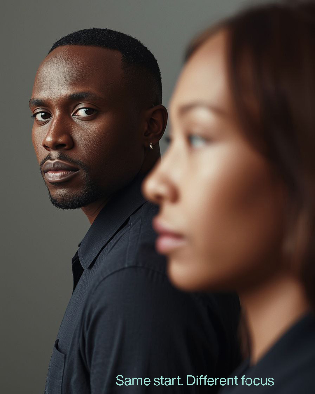 The series shows how men and women may appear to start from the same position, yet experience different levels of visibility, recognition, and opportunity.