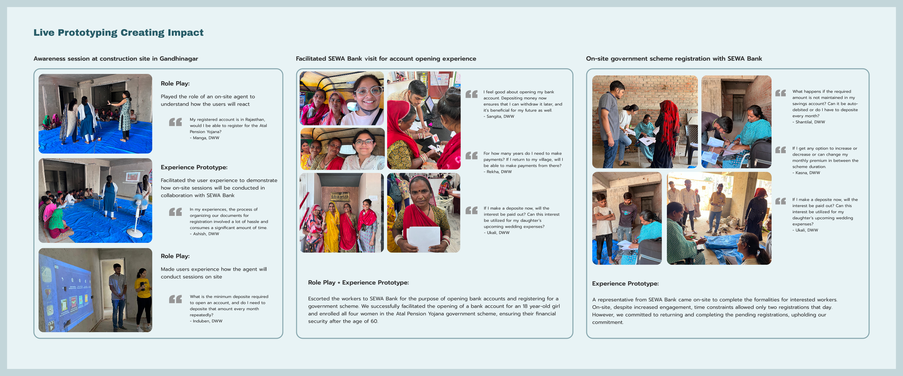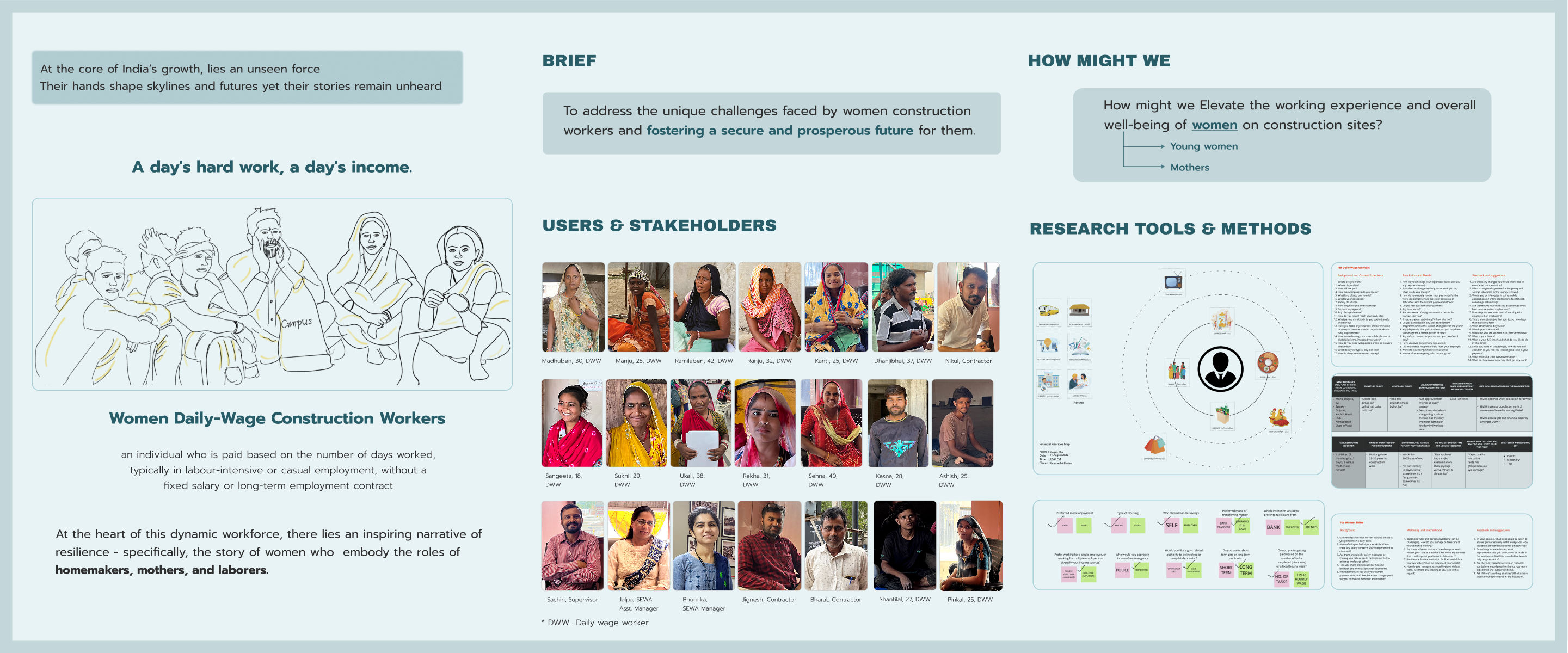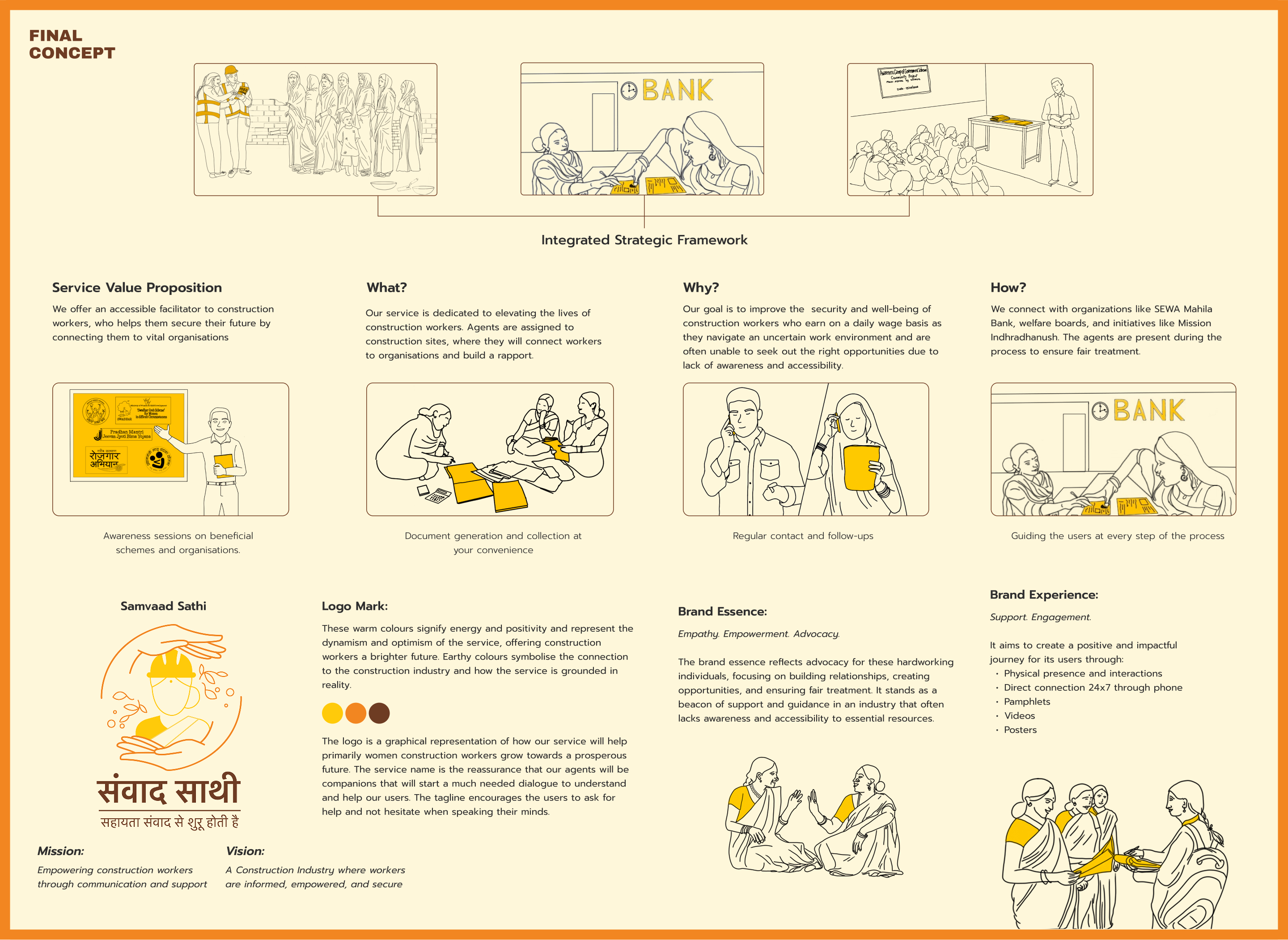 Samvaad Saathi is a practical empowerment service enabling women daily-wage construction workers to take control of their finances and secure their future. The project began with immersive field work, including interviews, observation, and collaborative workshops with women workers, NGOs, and local authorities, to understand the real challenges they face in accessing banking and social security services.