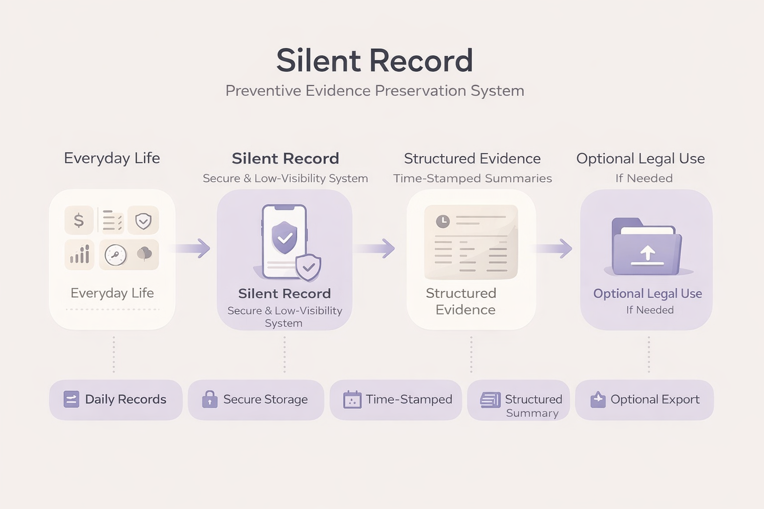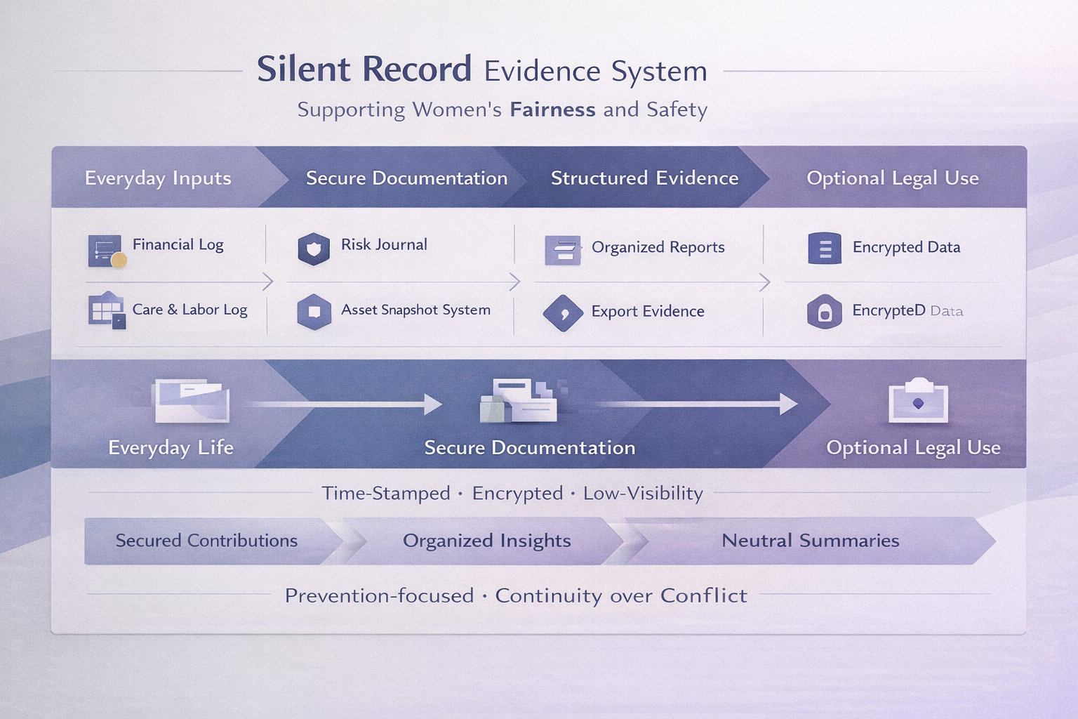 To leave zero visible records in order to protect users from threats or criminal risk, all data is time-encrypted under a camouflage menu and can be exported into structured evidence in legal formats, allowing the platform to function both as a preventive tracking tool and as a provider of AI-generated documentation suitable for legal review at any time. The design has always been privacy-first, promising low visibility, discretion, and user safety throughout. It appears as a daily-use application and can only be accessed by password. Certain gestures, such as double-clicking the back of the phone, enable instant access or recording. By embedding evidence creation into everyday life, the system helps women enter legal processes with greater preparedness, continuity, and structural advantage.